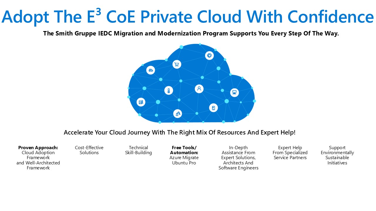 You deserve a cloud built to lift people - not just process data. With the Smith Gruppe IEDC and E3 CoE private cloud platform, you gain: